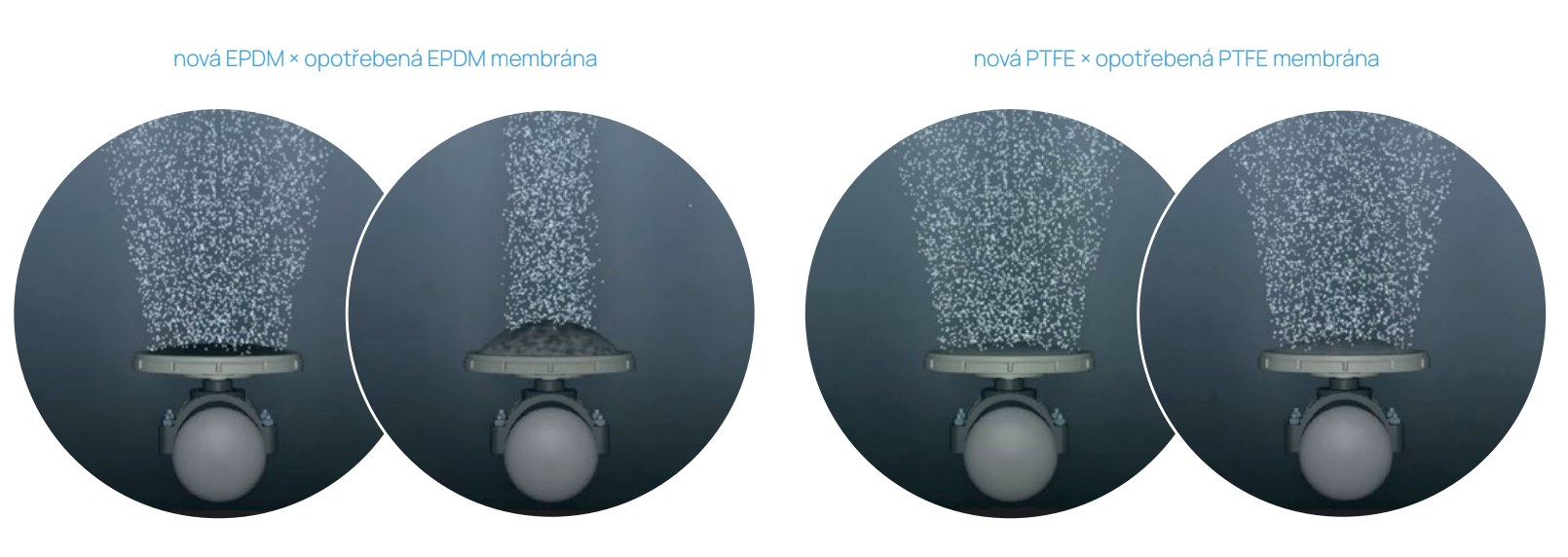 Membrány z PTFE mají vysokou odolnost proti zanášení a dlouhou životnost. Jsou vhodné pro náročné provozy s vysokými nároky na čistotu a minimální údržbu.