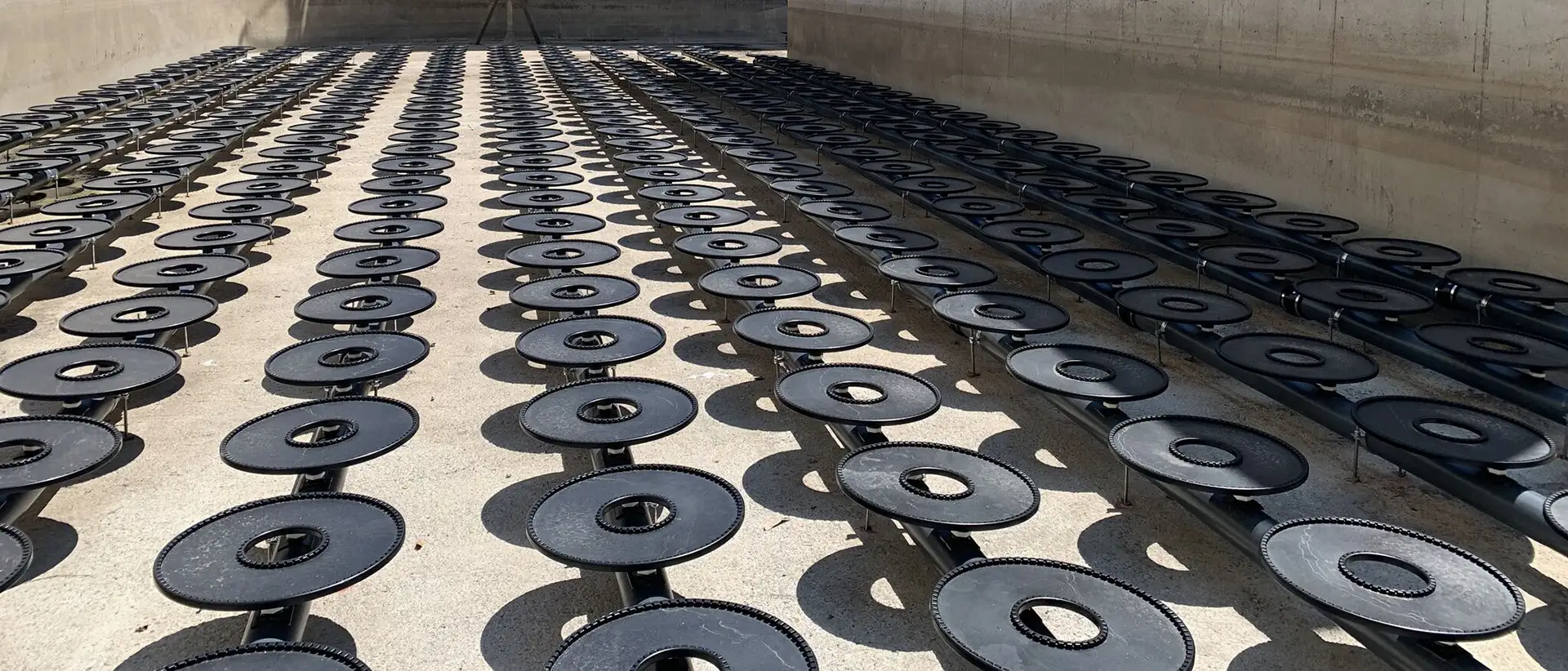 - Rošty s diskovými difuzory – pro jemnobublinnou aeraci, vysokou účinnost kyslíkového přenosu a nízkou spotřebu energie.